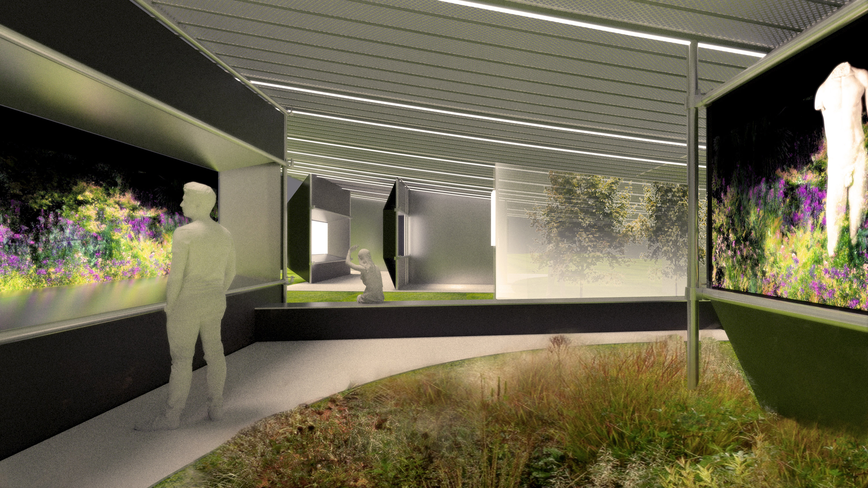 The cables of the catenary curve delicately capture and define the proportions of the screens and vitrines which are further supported by a proprietary scaffold system, clad in aluminum panels. The reflective finish of the panels perceptually extends the work on display into space of the garden. Lights are run intermittently along these cables and set into the vitrines, exaggerating the widening perspective form and creating the possibility for night time use.